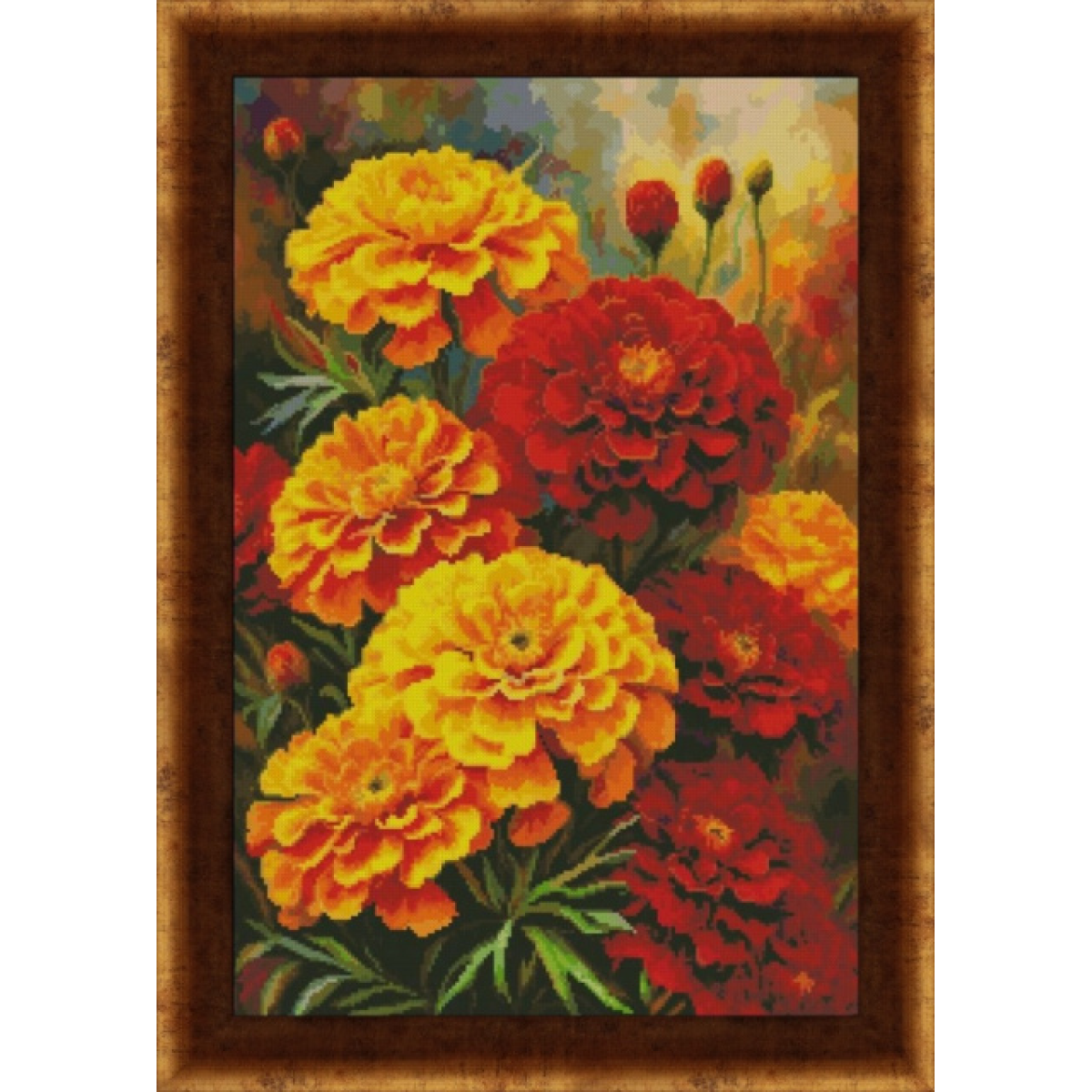 Цей набір — для тих, хто вишиває не просто квіти, а енергію кольору. «Квіткова феєрія» — це яскрава композиція з бархатців у жовтих, помаранчевих і червоних тонах на глибокому темному тлі. Кожна квітка — як спалах тепла, кожен стібок — як дотик сонця. Робота насичена, декоративна, з сильним візуальним ефектом.