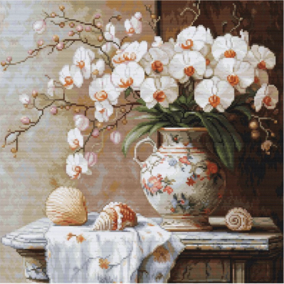 Набір для вишивки хрестиком Luca-S B714 «Елегантність орхідеї» — це витончений та стильний натюрморт, що поєднує екзотичну красу білих орхідей із морською тематикою. Завдяки ніжній палітрі та детальному опрацюванню пелюсток, готова робота виглядає надзвичайно реалістично та елегантно.