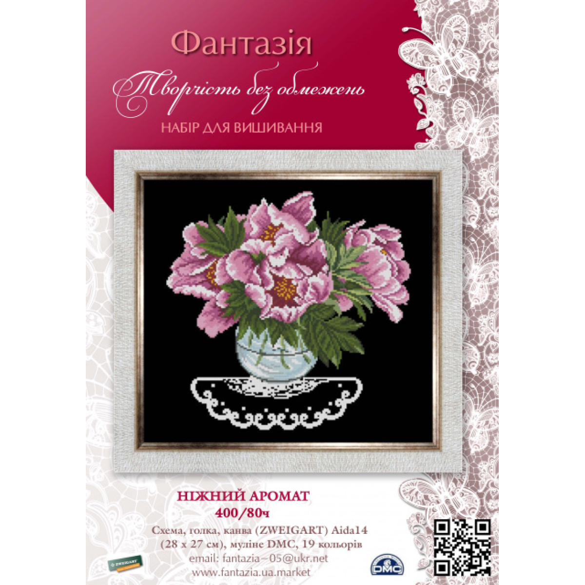 Набір для вишивання хрестиком ТМ Фантазія «Ніжний аромат» — це втілення витонченості та природної краси у кожному стібку. Яскравий букет рожевих півоній у прозорій вазі на мереживній серветці виглядає надзвичайно ефектно завдяки контрастному чорному фону, що додає картині глибини та художньої виразності.