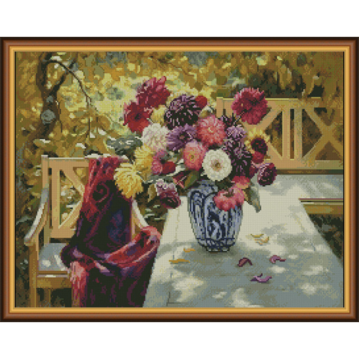 Цей набір — справжня знахідка для тих, хто хоче зупинити мить тихої осінньої краси та наповнити дім затишком. «Осінній сад» — це мальовничий натюрморт, що зображує сонячну терасу з розкішним букетом айстр у класичній вазі. Гра світла й тіні на столі та золотаве листя саду створюють атмосферу спокійного пообіднього відпочинку.