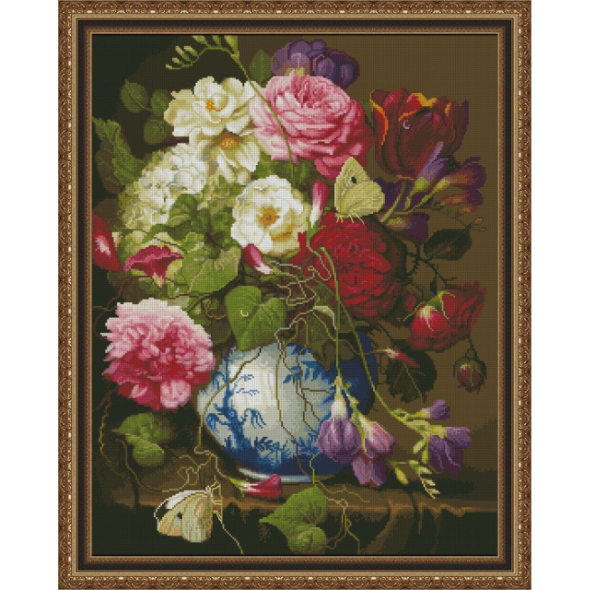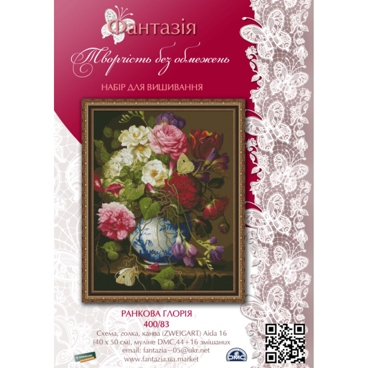 Цей набір — для тих, хто вишиває не просто інтер'єрну картину, а прагне зупинити мить ранкової свіжості та природної досконалості. «Ранкова Глорія» — це розкішний квітковий натюрморт, що зображує пишний букет троянд, петуній та витончених дзвіночків у класичній вазі. Особливого шарму сюжету додають тендітні метелики, що завітали на аромат квітів, створюючи атмосферу живого, сонячного саду.